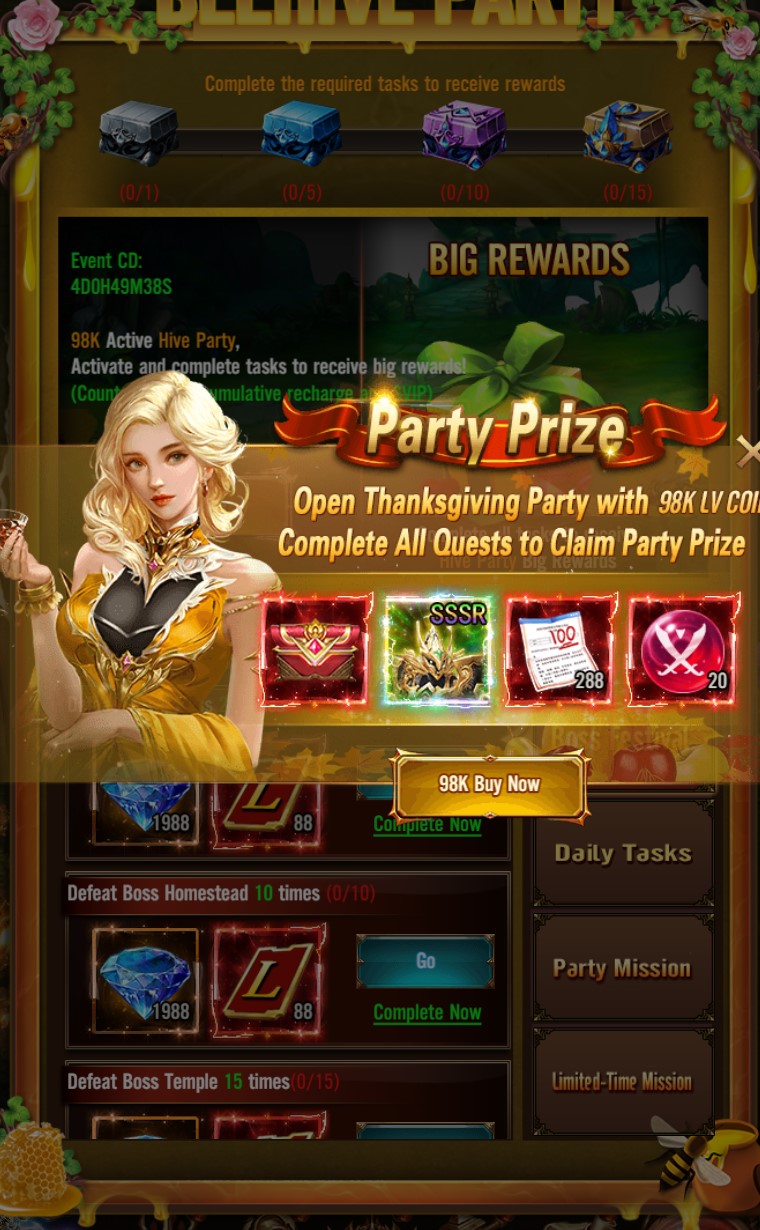 Complete Tasks: Complete event tasks to receive diamonds and LV vouchers. Additionally, you can activate special event rewards to receive extremely valuable items, especially the Red Equipment Chest.