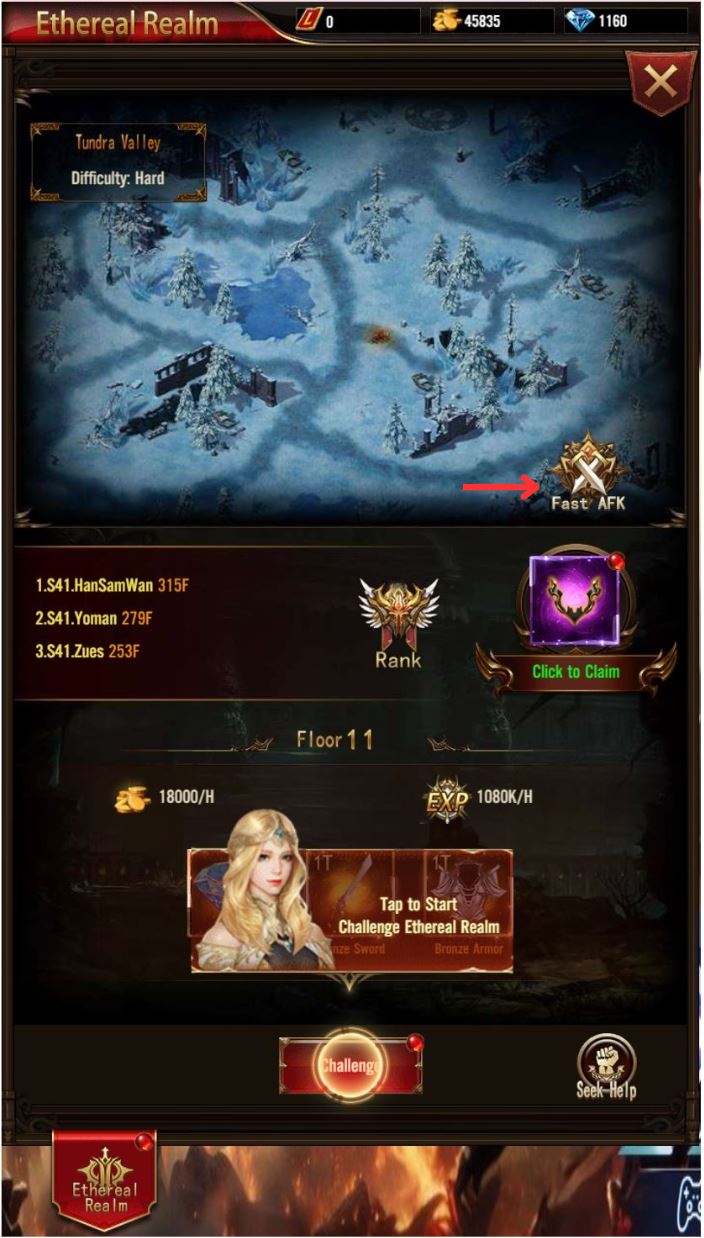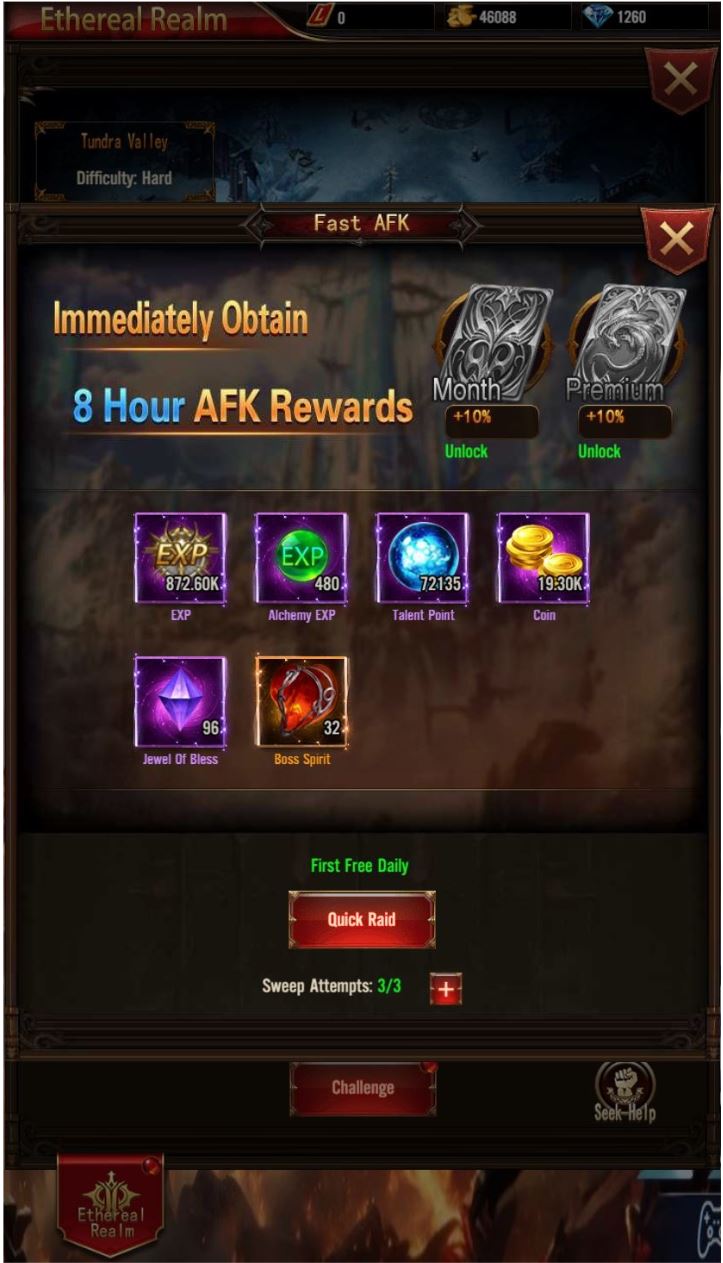 With the Fast AFK system, you will collect abundant resources such as gold, experience, Talent points, and Jewel of Bless.